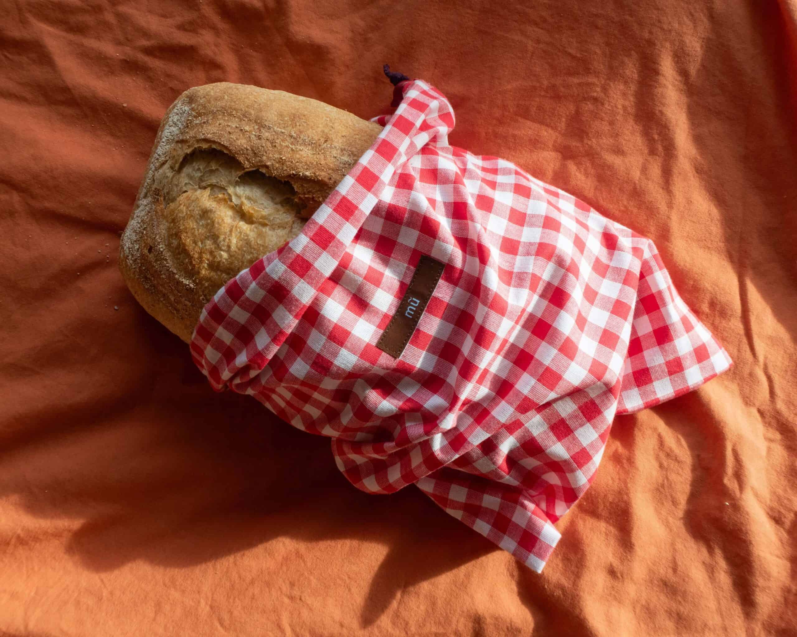 Checkered (bread) bag with a drawstring. Would probably fit 5 bananas, 3 croissants or 1 loaf.
